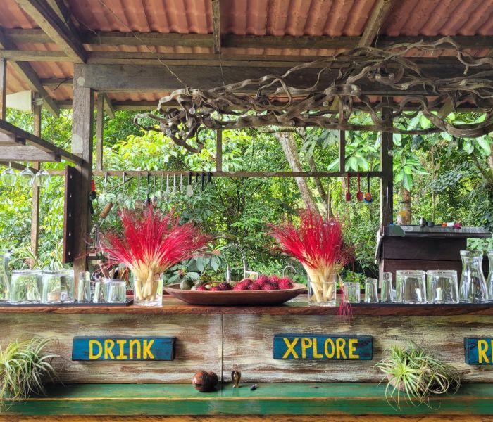 Bienvenue au « EL MONO » Nous sommes ici au cœur de l’écolodge. Entièrement ouvert, le restaurant offre une vue imprenable sur la mer des caraïbes. Le lieu est idéal pour l’observation des colibris, des paresseux, des papillons, etc.